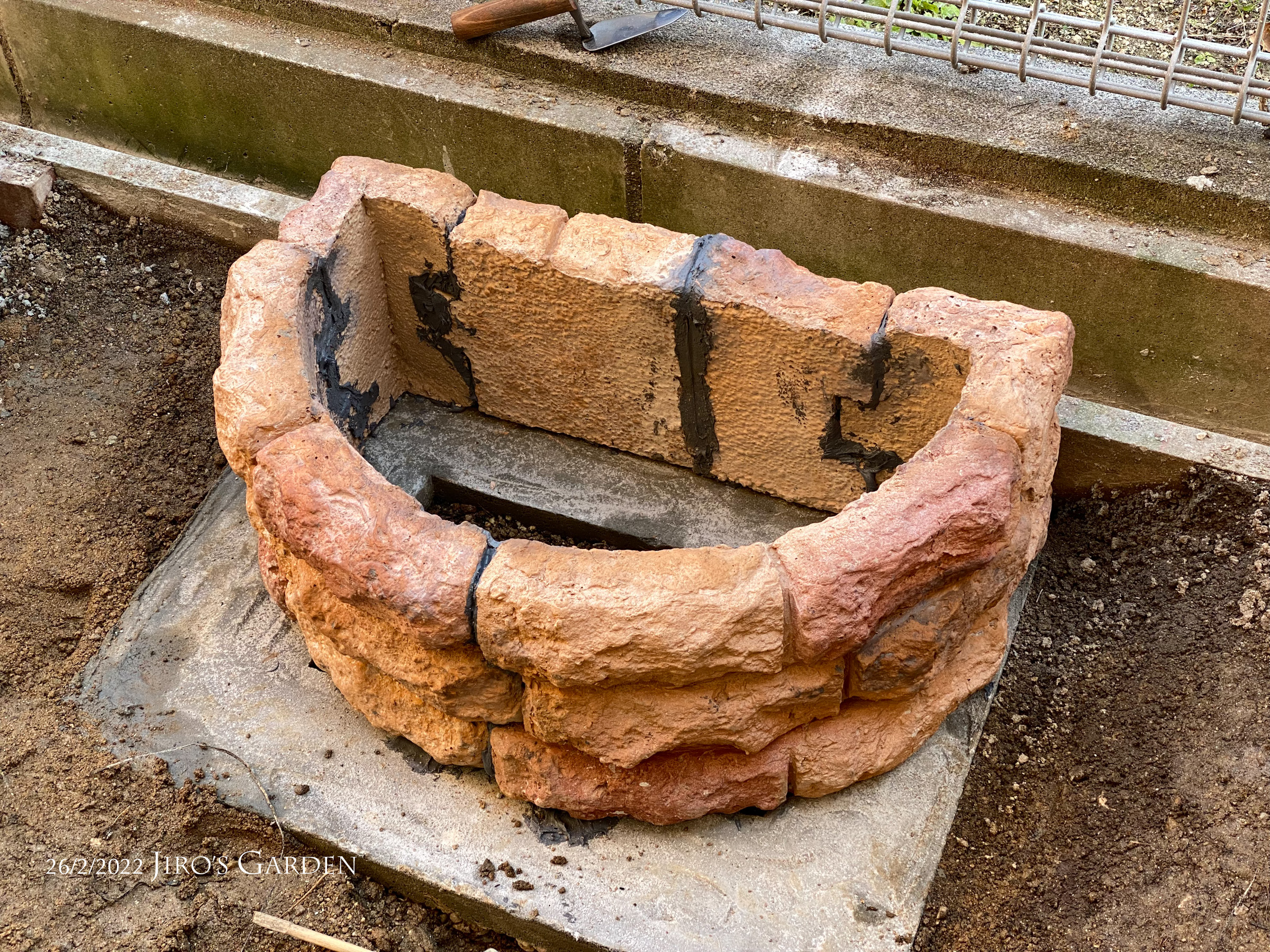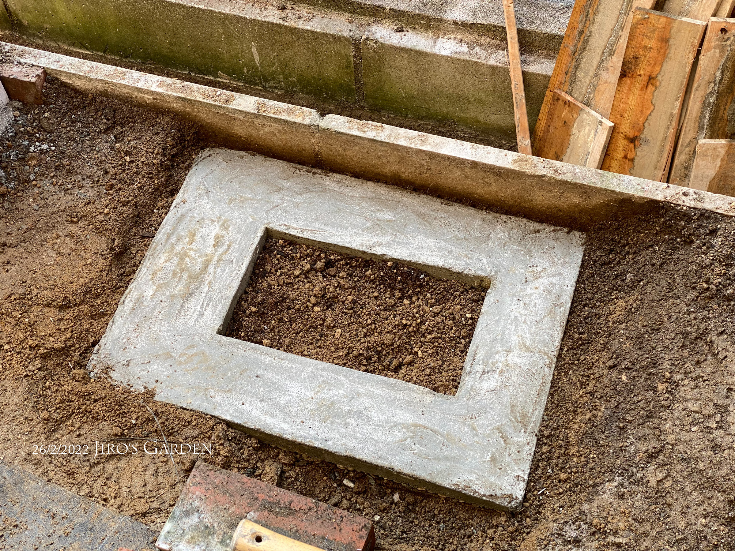 モルタルは余ってしまうと簡単に捨てることができないので持て余します。また後片づけで出るモルタルのゴミも処理が容易ではありません。なので、できるだけ一度に作業してモルタルのゴミが少なくなるようにしたいのです。最終的に庭作りが完了したら、捨てられなかったゴミや資材などは産業廃棄物として処分するつもりです。土は適宜箕面のニコ・ガーデンさんで引き取ってもらいます。