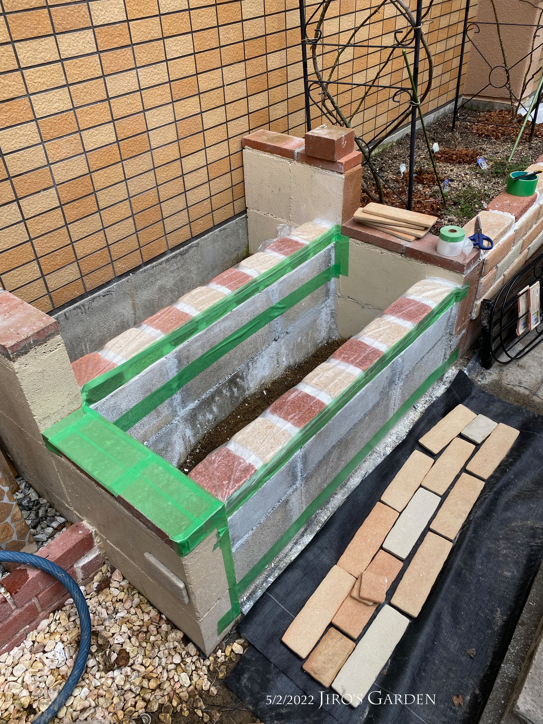 コンクリートブロックをモルタルで固定して、笠木にベージュと茶色、2色の角丸レンガを白いモルタルで接着した様子。