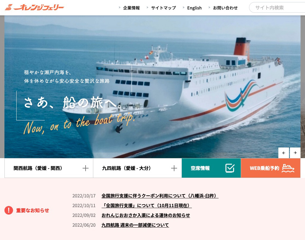 オレンジフェリーで行く豪華な船旅。大阪南港・神戸から四国愛媛の東予・新居浜へ。松山道後温泉にも便利!20時より乗船し、船内でご入浴・お食事ができますので、ごゆっ…