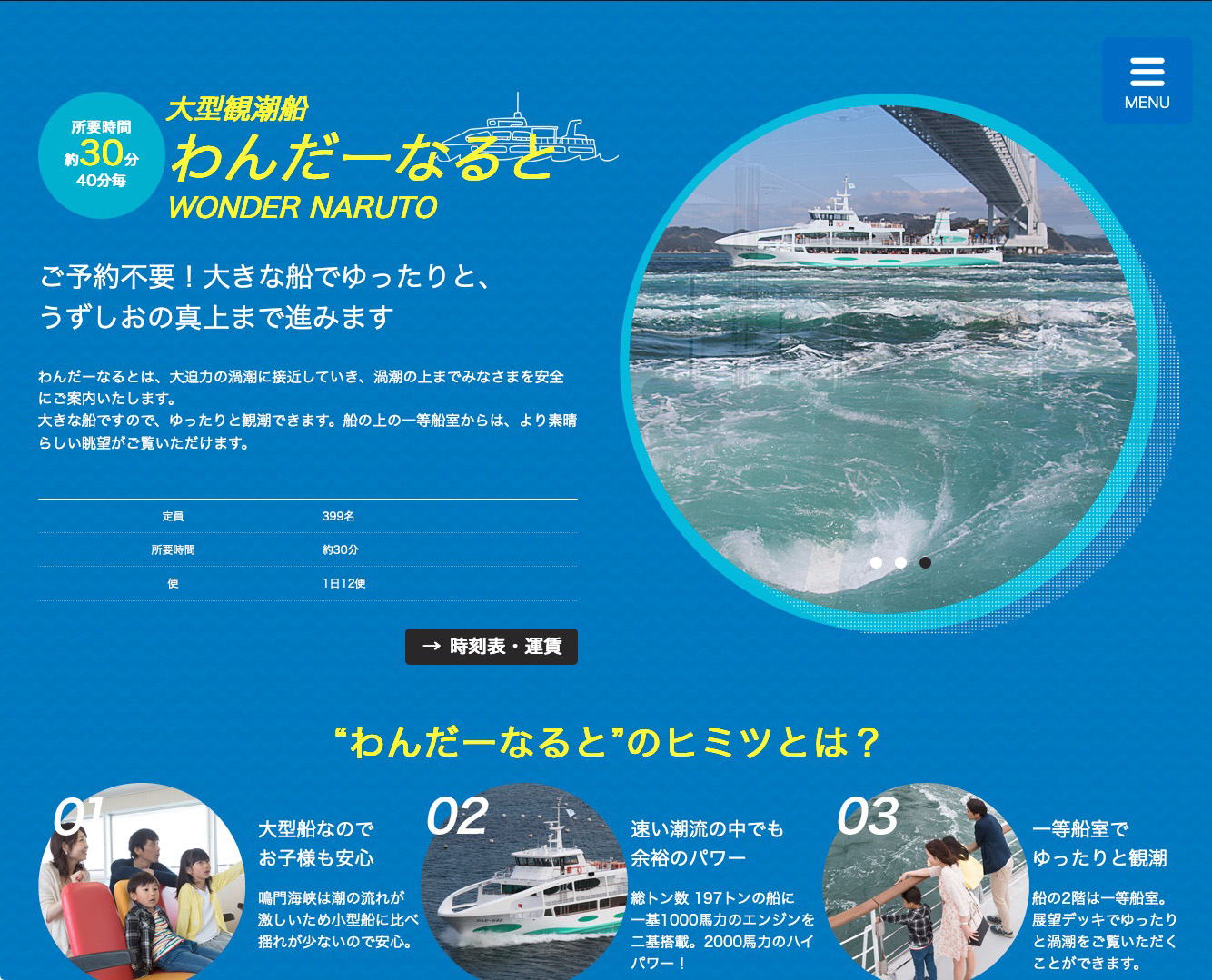 うずしお観潮船「わんだーなると」と「アクアエディ」の時刻表・運賃のご案内。世界最大級の渦潮に大接近できる、2つの観潮船の特徴もご紹介。水中も観潮できる、アクアエ…